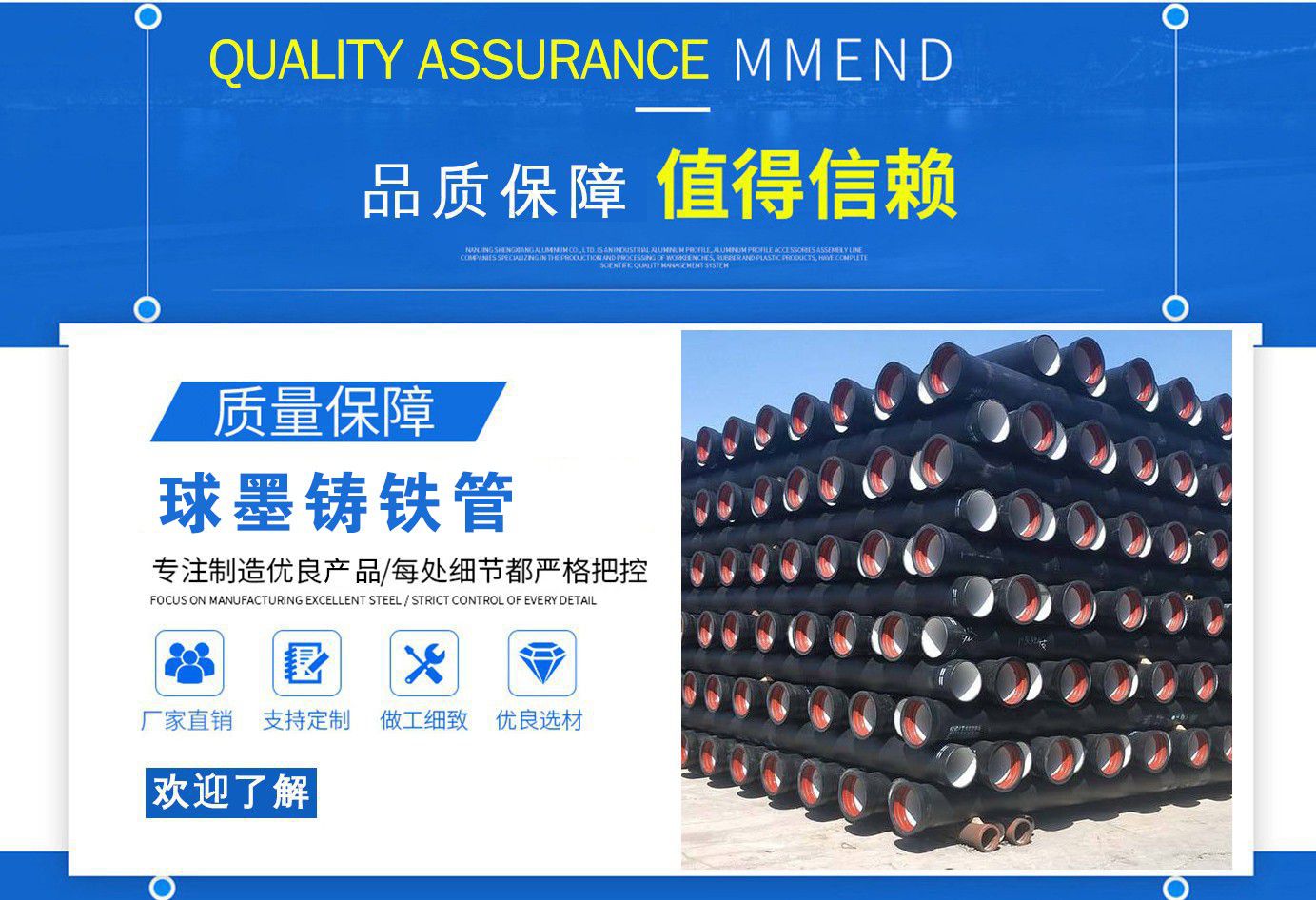 山西飛翔鑄業(yè)有限公司是一家以新興技術(shù)致力于研制開發(fā)、生產(chǎn)、銷售、施工安裝各種球墨管廠家,球墨鑄鐵管價格,國標(biāo)球墨管,k9球墨鑄鐵管,國標(biāo)球墨鑄鐵管,離心球墨鑄鐵管等系列鑄鐵產(chǎn)品。公司擁有完善的銷售、售后服務(wù)體系及一支由鑄造專家、工程師組成的精通產(chǎn)品設(shè)備和生產(chǎn)鑄造的技術(shù)力量隊伍。隨著企業(yè)的發(fā)展,我們積累了豐富的鑄造經(jīng)驗與科技水平。使得產(chǎn)品具有高強度、高韌性、耐腐蝕性強等性能。同時,我們獲得質(zhì)量管理體系認(rèn)證、產(chǎn)品質(zhì)量認(rèn)證、職業(yè)健康體系認(rèn)證、環(huán)境管理體系認(rèn)證。產(chǎn)品暢銷各地并打入韓國、新加坡等東南亞市場。 在未來的發(fā)展中,公司奉行誠信共雙贏,合作創(chuàng)盛世的企業(yè)理念。讓我們一起共創(chuàng)美好未來! 公司產(chǎn)品采用良好的工藝流程,以確保產(chǎn)品質(zhì)量的穩(wěn)定性:以良好的設(shè)備,確保質(zhì)量的可靠性。廣泛應(yīng)用于國內(nèi)外城市的市政建設(shè),通信,自來水,消防,園林,環(huán)保等行業(yè),產(chǎn)品大獲贊譽! 我們有多年的井蓋生產(chǎn)經(jīng)驗,多名老技術(shù)工人有將近二十年的生產(chǎn)經(jīng)驗,還聘請多名新技術(shù)研發(fā)人員,因為我們始終堅信質(zhì)量才是未來生存的根本,只有把質(zhì)量保證了,企業(yè)才會有更加美好的未來。公司堅持用心服務(wù),誠信為本,與時俱進(jìn),科技為先的企業(yè)理念,堅持科技先導(dǎo)、竭誠為廣大用戶服務(wù)。歡迎各界朋友蒞臨我公司參觀,指導(dǎo)洽談業(yè)務(wù),相信選擇我們就是選擇我們共贏的明天...